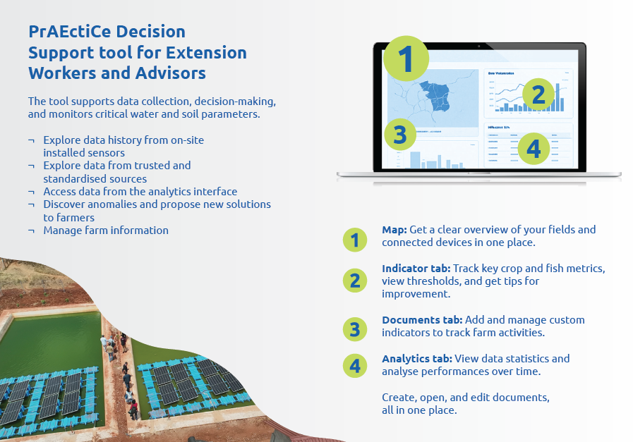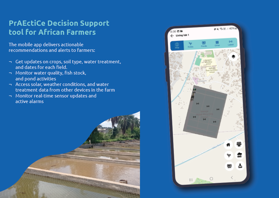 The DST comes in the form of a mobile application and a desktop interface. Users update their farm profile page with data from their crops, soil type, water quality, fish stock, crop and fish harvests, and any other activities. At the same time, they get updates on the solar activity, weather conditions and water quality parameters from real-time sensors, which also alarm them in case of emergency. Finally, the app delivers recommendations and advice to the farmers and other users, on how to proceed with their farming practice or how to deal with an issue that they could be facing.